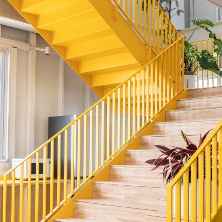 脱炭素社会の実現に貢献する継続的なZEB運用を目指し、かつ建物利用者の健康状態や知的生産性の向上を図れるよう、バイオフィリックデザイン※1やActivity Based Working (ABW)※2 というワークスタイルを導入しています。また、室内の空気質や光環境のみならず、昇降デスクの採用、利用したくなる階段による運動促進やコミュニティを生む空間を創出しています。