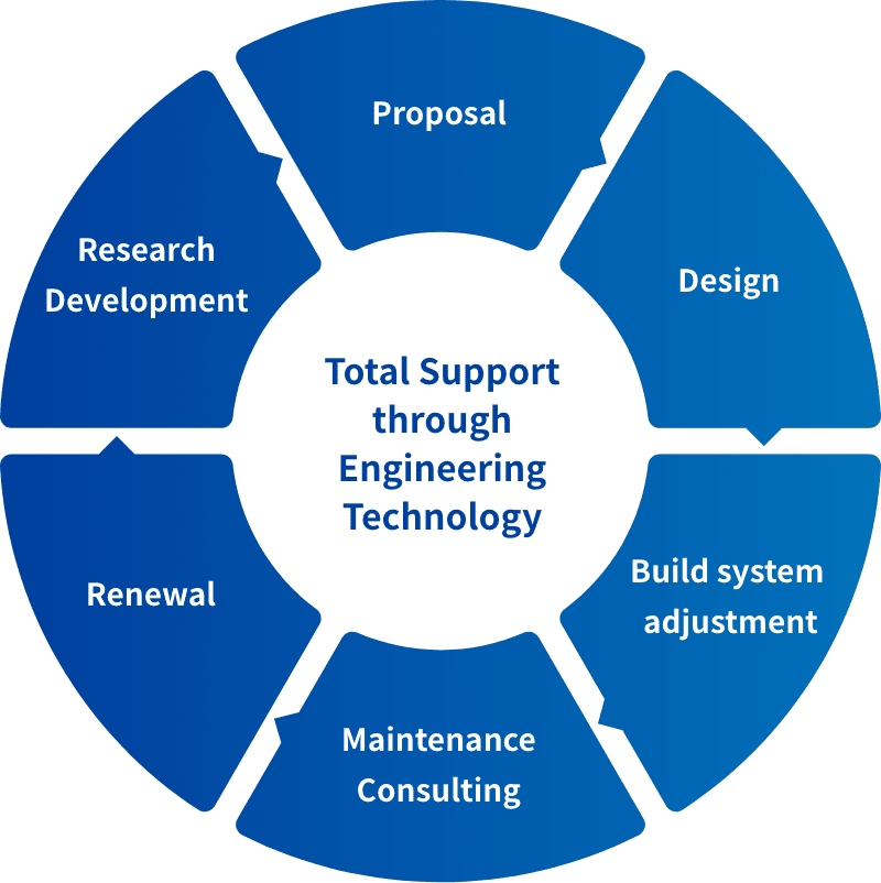 We provides total support for customers’ buildings by utilizing engineering technology in various phases of the building’s life cycle, such as planning and proposals, design and build, system adjustment, maintenance after delivery, and renovation.